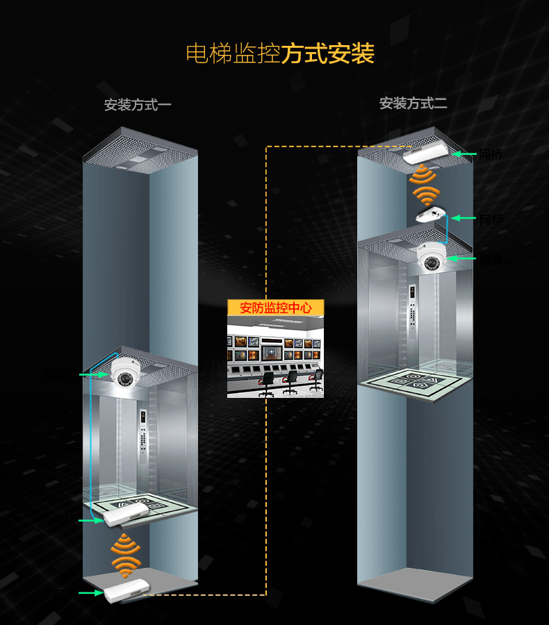 電梯內(nèi)底部已全部封閉,無法使用就近光纖節(jié)點(diǎn)對(duì)電梯視頻數(shù)據(jù)做傳輸,而電梯頂部留有電梯線纜口。這種情況下利用電梯轎廂與頂部的空隙空間,在電梯轎廂頂部安裝1臺(tái)專用無線網(wǎng)橋與電梯線纜口安裝的1臺(tái)電梯專用無線網(wǎng)橋進(jìn)行數(shù)據(jù)傳輸,通過網(wǎng)線使用交換機(jī)把各電梯的視頻數(shù)據(jù)集中,最后通過豎井使用網(wǎng)線或者在樓層頂!使用一對(duì)電梯專用網(wǎng)橋,把集中的視頻數(shù)據(jù)傳回機(jī)房,通過硬盤錄像機(jī)在大屏上顯示,整套方案,安裝簡(jiǎn)單,施工工期短,便于后期問題的排查,維護(hù)。